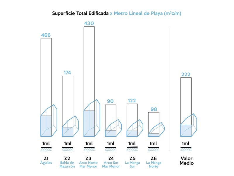 Los metros cuadrados construidos son de media 222 en las llanuras de costa regional, con un máximo de 430 en el Arco Norte y un mínimo de 98 metros en la parte norte de La Manga, donde se da prácticamente la equivalencia de una casa por metro de playa.