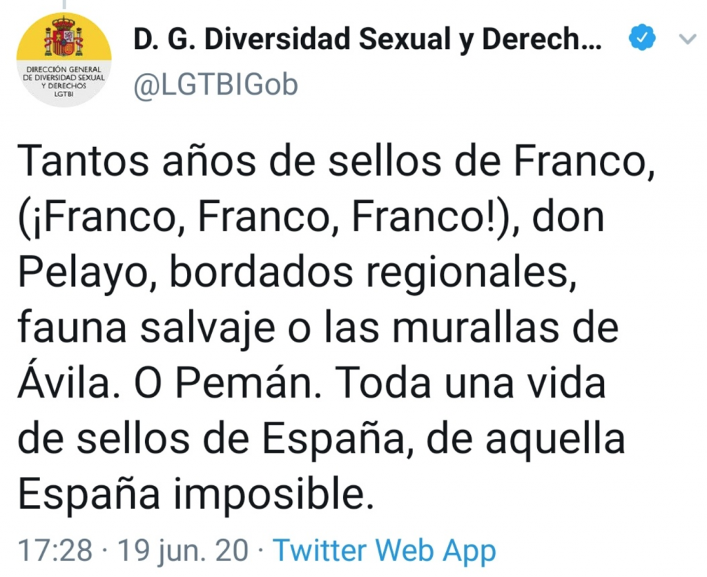«Tantos años de sellos de franco (¡Franco, Franco, Franco!), don Pelayo, bordados regionales, fauna salvaje o las murallas de Ávila. O Pemán. Toda una vida de sellos de España, aquella España imposible», comentó la cuenta oficial de la Dirección General de Diversidad Sexual y Derechos LGTBI. Por supuesto, el alcalde de Ávila no se hizo esperar y envió una carta al ministerio de Montero para expresar su malestar por este desafortunado tuit, ya que no hay que olvidar que la muralla, además de formar parte del patrimonio mundial de la UNESCO, es una construcción defensiva románica del siglo XI brillantemente conservada.