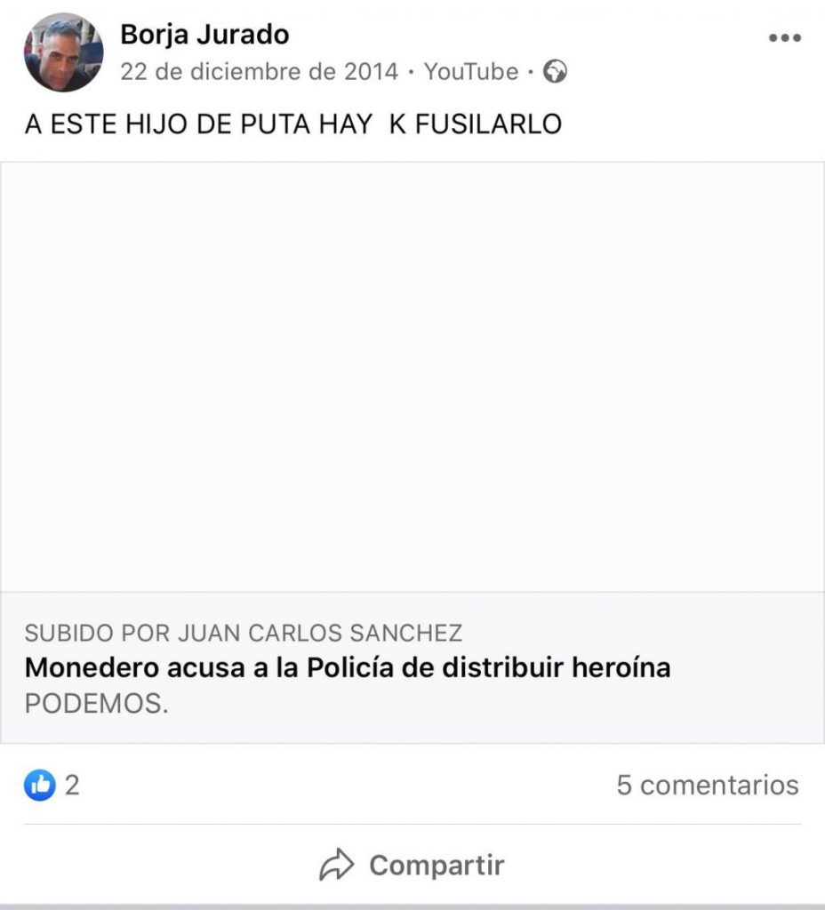 Pero lo que de verdad puede parecer una fijación con la ejecución militar lo dijo dos días después, un 22 de diciembre también de 2014. Un artículo circulaba entonces por Internet, el mismo que sugería que Monedero había acusado a la Policía de distribuir heroína, algo absolutamente inaceptable para Jurado, por lo que dejó claras sus intenciones: «A este hijo de puta hay que fusilarlo», comentó.