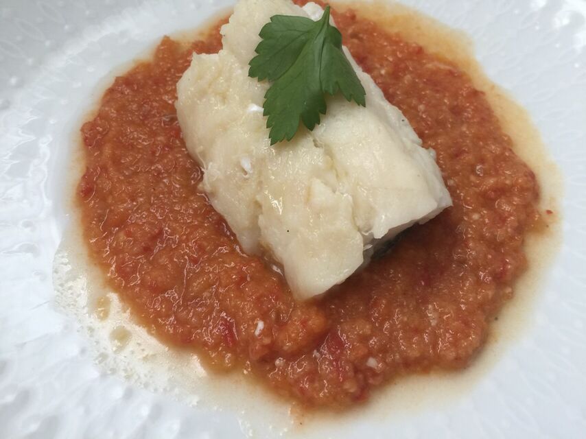 Este plato se puede cocinar tanto sólo o acompañado de patatas fritas o un puré de verduras. Con el robot de cocina, necesitamos entre 30-35 minutos para disfrutar de un plato donde resaltan el bacalao y las verduras. Para darle sabor, también añadimos aceite de oliva, pimienta negra y pimentón dulce para obtener el tono rojizo de la salsa.