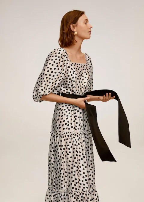 El vestido posee un estampado con topos. El tejido es fluido y está compuesto por un escote cuadrado. La manga corta está abullonada y la falda lleva volantes. En la parte intermedia, el vestido está atravesado por un cinturón negro ancho. También tiene un cierre ancho en la espalda. El precio de este vestido es de 39,99 euros, con un descuento del 30 por ciento.