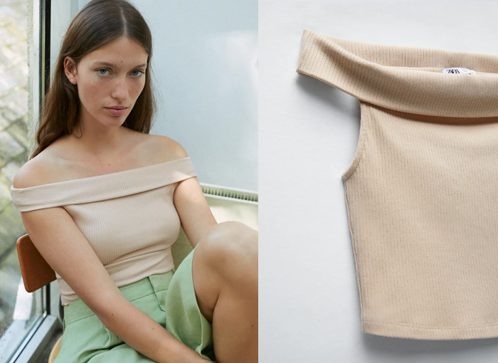 Aunque no se encuentra en la sección de ofertas de Zara, esta camiseta hombro descubierto se puede encontrar a un precio muy económico. Por ello merece estar en esta selección de gangas para ahorrar este verano.