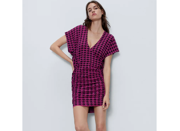 Por 15,99 euros, un 45% de descuento con respecto a su precio habitual de venta (29,95 euros), es posible comprar este vestido pata de gallo, el cual está confeccionado en viscosa, poliamida y poliéster, con un acabado en color rosa y negro.