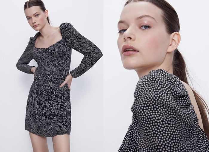 Es un vestido negro con lunares en color blanco, fabricado en viscosa obtenida a partir de madera de bosques gestionados de manera sostenible. Es una prenda corta de escote amplio y manga larga abullonada en hombro con cremallera en puño. Tiene un sistema de cierre en espalda con cremallera oculta.