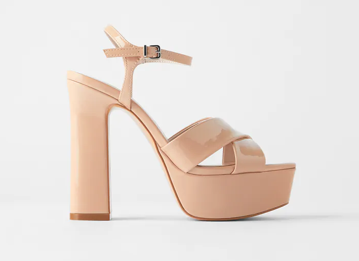 Si buscas renovar tu zapatero para este verano aprovechando las rebajas de Zara, una de las opciones que puedes valorar si buscas unos zapatos de tacón alto es esta sandalia plataforma de charol.