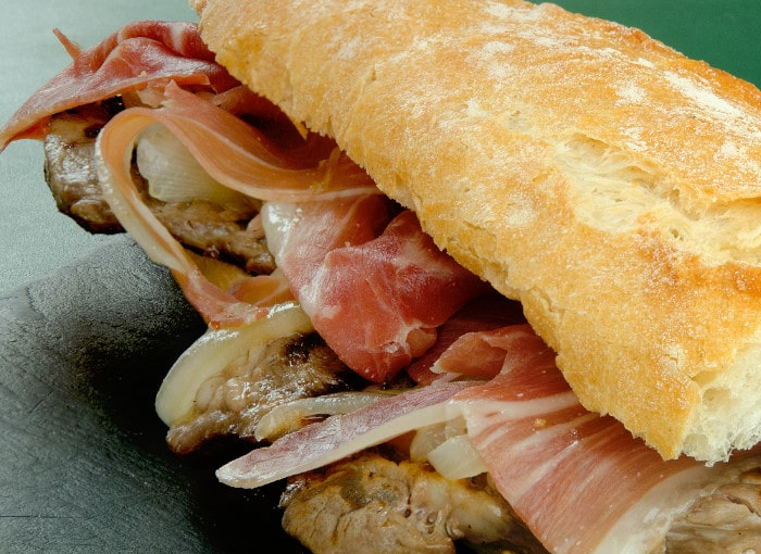 Finalizado este tiempo podrás montar el bocadillo, colocando la ternera, la cebolla por encima y luego las lonchas de jamón serrano. Así de simple y en unos 20 minutos.