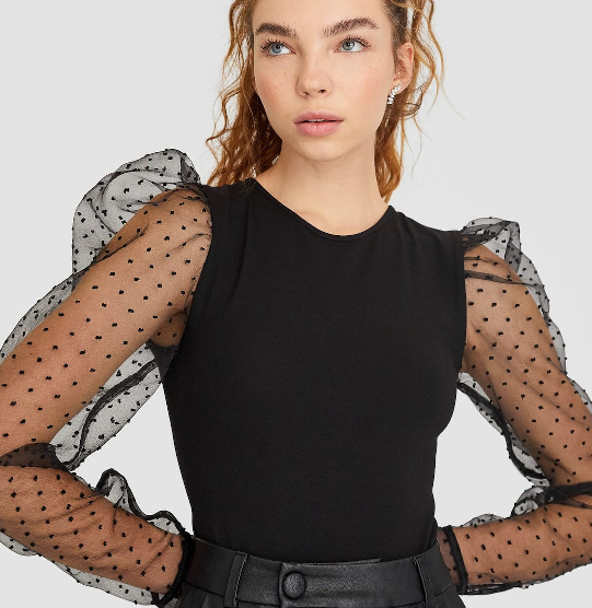 Volvemos de nuevo a las mangas abullonadas ¿Por qué? porque nos encantan y, simplemente, sientan muy bien. En este caso, Stradivarius nos presenta una preciosa camiseta con las manga son en color negro y transparente con puntos también negros. Todo un acierto para cualquier momento tarde-noche, cena casual o paseo nocturno que podrás conseguir por tan solo 9,99 euros ¡Atención, antes valía 19,99! todo un suculento descuento del 50%.