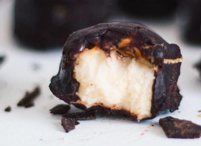 Después derrites chocolate blanco y negro en un recipiente, logrando que quede el chocolate marmolado. Por este chocolate rodas el bombón hasta cubrirlo por completo. Finalmente lo llevas al congelador hasta el momento de consumir.