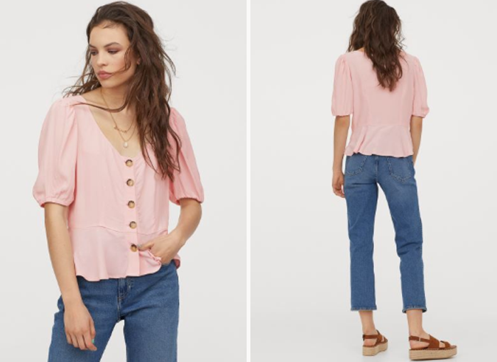 Esta blusa con manga puffy H&M es una de las prendas que no pueden faltar en tu armario teniendo en cuenta que está al 50% de descuento en la tienda de la conocida cadena de tiendas sueca. Tiene un coste de 9,99 euros en rosa claro.