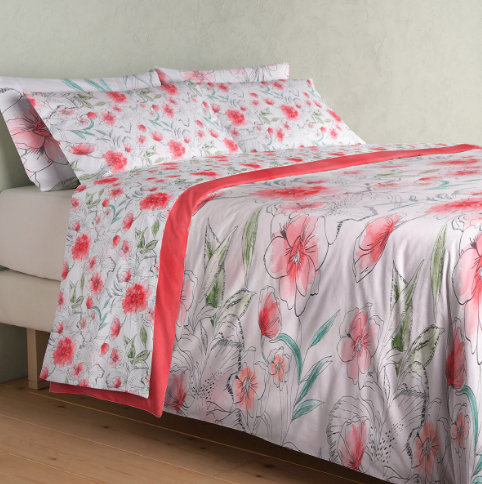Reig Marti es una marca especializada en todo lo relacionado con el descanso, incluyendo la ropa de cama. En El Corte Inglés tenemos rebajado este juego de encimera y funda de almohada con un diseño de colores primaverales y veraniegos, con tonos coral y verde sobre fondo blanco, ideal para darle alegría y vitalidad al dormitorio. Además tiene un efecto acuarela muy original. Está fabricado en 50% poliéster y 50% algodón, una mezcla que le otorga resistencia y que hace que apenas se arrugue, por lo que se puede planchar muy fácilmente. El precio es de 12,95 euros.