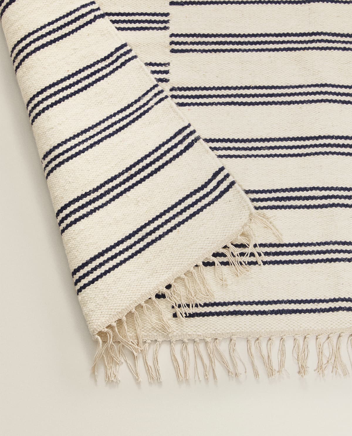 Uno de los imprescindibles que debemos tener en nuestro dormitorio es una alfombra. En el caso de que necesitemos darle un toque diferente y sofisticado, podemos optar por una que combine con todo, como esta de rayas.