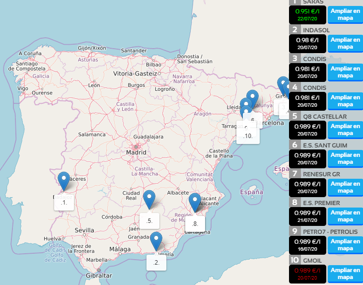 La página web Diesel o Gasolina del Ministerio de Transición Ecológica te proporciona los datos en tiempo real a través de un mapa con las localizaciones de las gasolineras con el precio del litro de gasolina más barata. Tan solo debes ingresar en su web y visualizarlo en el mapa, o bien a través de un detallado listado. Asimismo, la página te proporciona datos sobre el tipo de consumo según tu vehículo y el tipo de gasolina que es más recomendable. Una completa guía para ti si conduces y quieres ahorrarte algún dinerito.