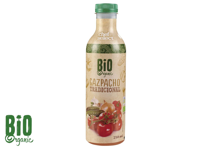 En la cadena de supermercados Lidl puedes encontrar este gazpacho ecológico tradicional de la marca Bio Organic, perteneciente a Chef Select, marca blanca de la empresa de origen alemán.