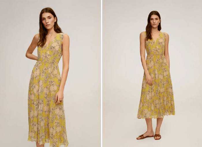 Con la llegada del verano los vestidos florales son tendencia, y este vestido plisado floral de Mango es una gran opción para quienes busquen uno de color amarillo. Este vestido midi está a mitad de precio, pudiendo encontrarse en oferta por 29,99 euros.