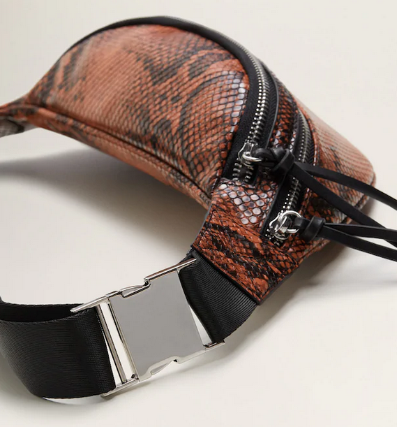 Retomando lo que nos ofrece Mango en los complementos para la mujer, encontramos esta sugerente riñonera que simula la piel de una serpiente. Y es que en verano, cuesta más sacar a pasear el bolso. Cuanto más calor hace, más nos cuesta, y más si además tenemos un plan de playa. Con la riñonera no tendrás que preocuparte del bolso y podrás llevar la mascarilla, la cartera y el móvil sin cargarte de más cosas. La riñonera de Mango cuenta con dobre cierre de cremallera y está forrada en el interior. Está disponible en tres acabados: naranja tostado, gris y negro (sin motivo animal print).