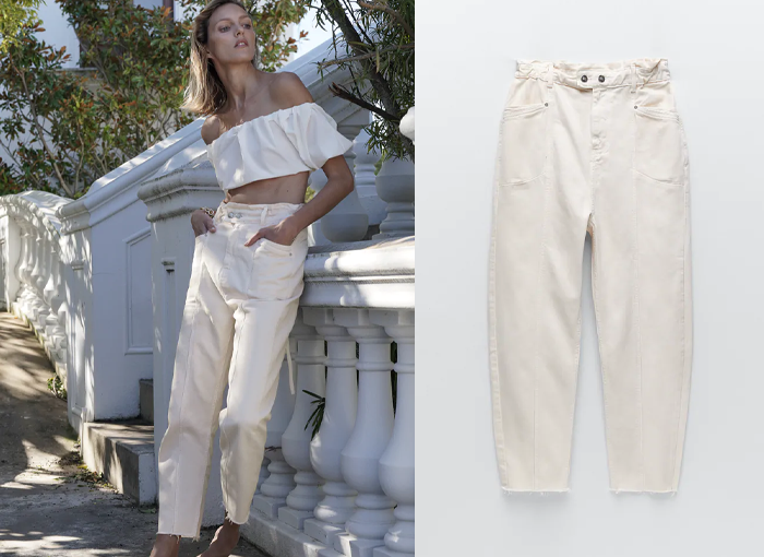 Uno de los pantalones de tendencia de Zara son estos Jeans Z1975 Baggy Paperbag de color crudo. Confeccionado en 100% algodón, tiene un precio de venta de 29,95 euros, una excelente opción para vestir durante el verano.