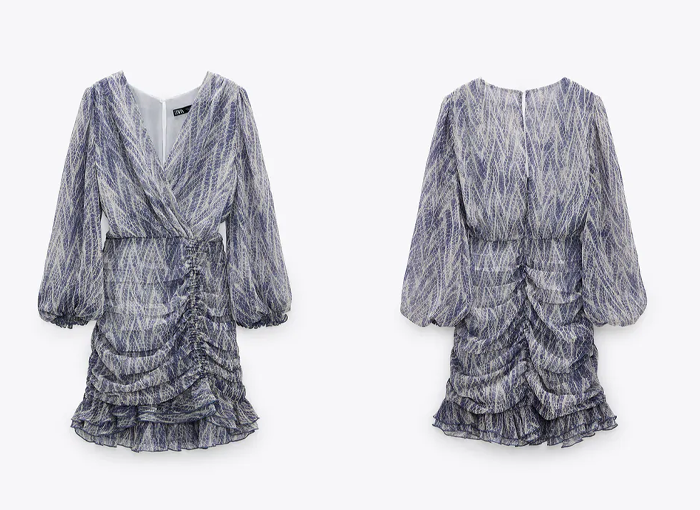 Este vestido drapeado con estampado animal es una tendencia veraniega de Zara, un modelo mini con detalle drapeado con escote en pico y manga larga. Su bajo es asimétrico y tiene un acabado con volantes y frunces. El cierre es en espalda con cremallera, abertura y botyón.