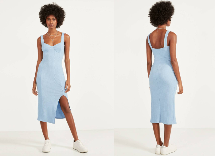 Bershka cuenta en su catálogo con una amplia variedad de vestidos que podrás utilizar para después de ir a la playa. Entre estas prendas cabe destacar este vestido midi corset, que se ha convertido en todo un Best Seller de la marca.