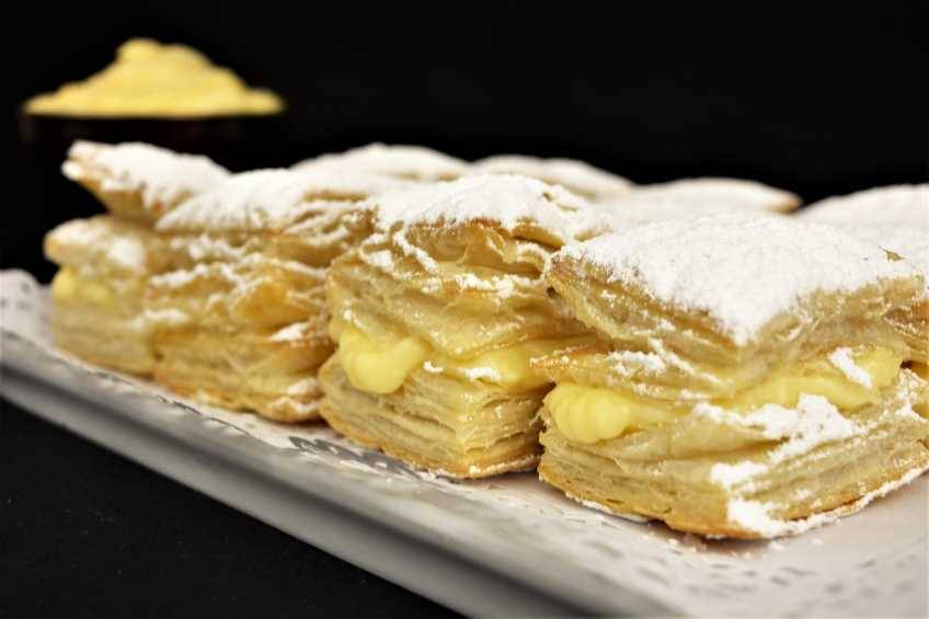 Para los miguelitos debemos extender la plancha de hojaldre y la dividimos en porciones iguales, a ser posible cuadrados. Con el horno calentado previamente a 200º, horneamos los miguelitos durante unos 15 minutos aproximadamente. Es recomendable que pongamos papel sulfurizado sobre la bandeja del horno. Cuando estén hecho, los retiramos y los dejamos enfriar sobre una rejilla. A continuación, con los hojaldres fríos, incorporamos la crema, no sin antes batirla de nuevo para que esté homogenea.