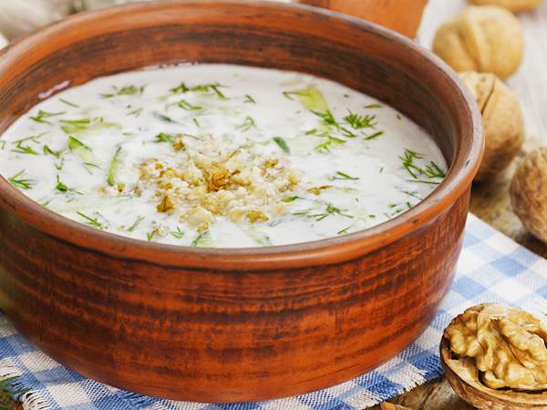 En un robot de cocina o batidora de mano, vertemos los yogures, los dientes de ajo pelados, el agua y la sal. Lo batimos hasta que quede perfectamente mezclado e incorporamos las nueces, el pepino, los condimentos y el aceite de oliva. De nuevo trituramos hasta que quede una crema fina, sin grumos. Si preferimos una consistencia más espesa, podemos añadir otro yogur.