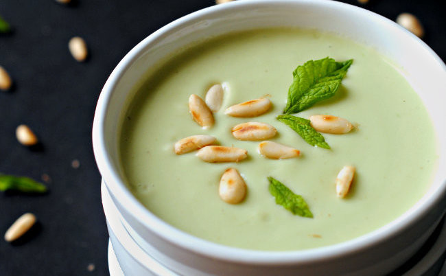 Ponemos los aguacates y la manzana pelados y troceados en el vaso de la batidora, junto el zumo de la lima y la ralladura de la mitad de la pieza. Incorporamos las hojas de menta, el yogur y el agua, salpimentamos y trituramos a máxima velocidad durante unos tres minutos. La textura tiene que quedar homogénea y aterciopelada.