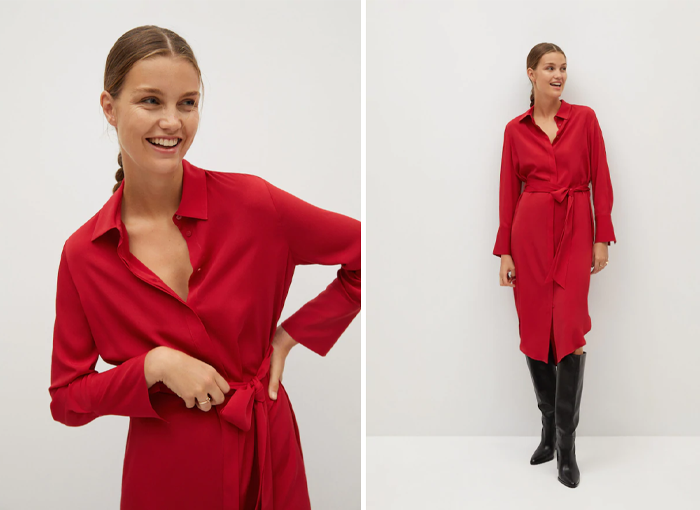 Este vestido camisero lazo de Mango es un modelo que podrás utilizar para cualquier fiesta a la que quieras acudir, siendo una prenda muy versátil que puede ayudarte a vestir de manera más o menos informal. Se encuentra disponible en color rojo y en gris tipo piel de serpiente.