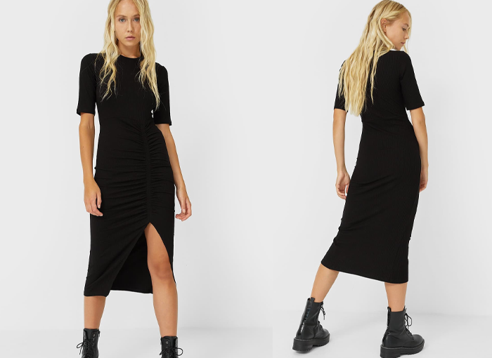 Uno de los vestidos más combinables del listado es este vestido mini canalé de Stradivarius, que se encuentra disponible en negro y gris marengo. Es una prenda sencilla y básica que te permite estilizar y afinar la silueta.