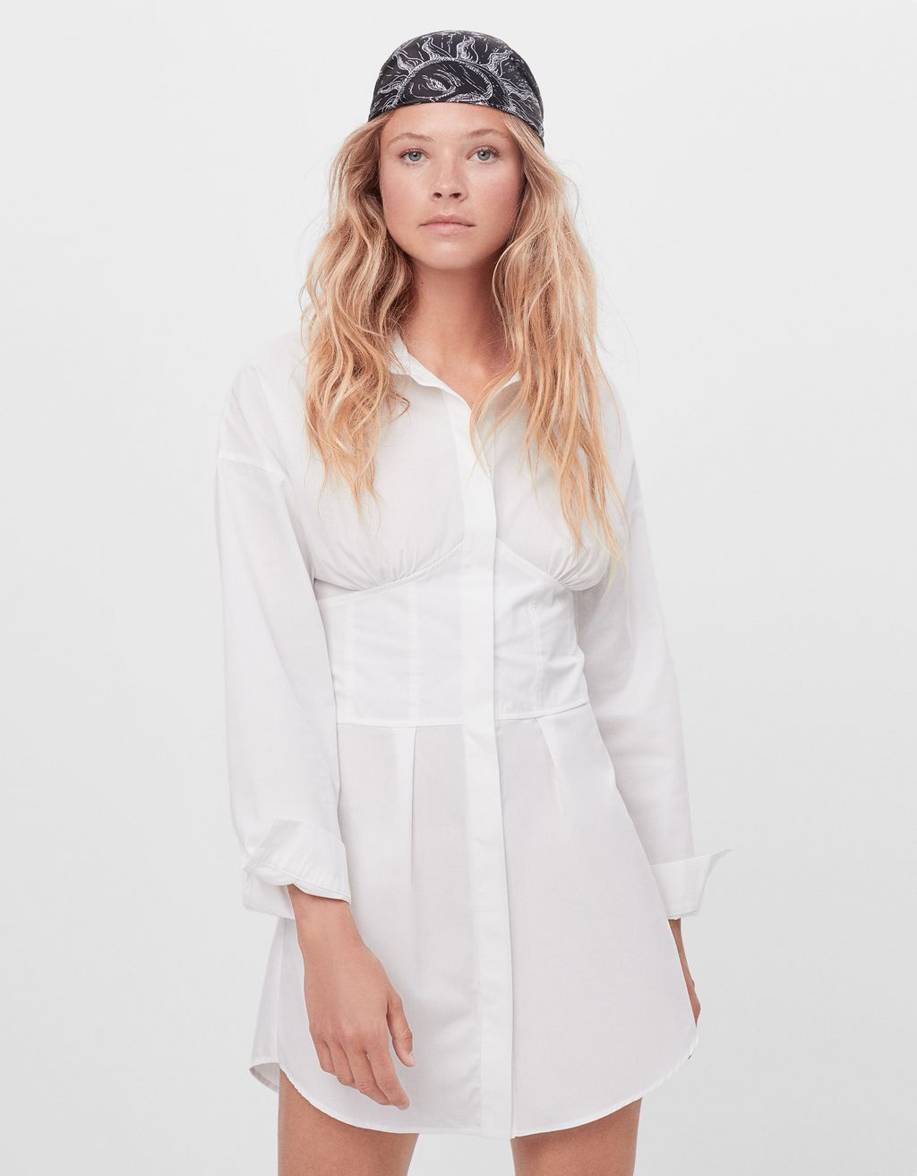 Las camisas vestidos están de moda, pues la versatilidad de la pieza resulta atractiva para que según la ocasión la adaptes a tu estilo. Ya sea más atrevido o conservador. En cualquiera de los casos no dejarás de brillar; estamos respondiéndonos a una camisa vestido popelín de Bershka. El color blanco como siempre aporta luz, paz y tranquilidad.