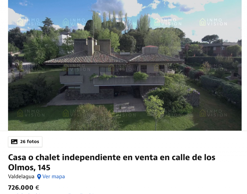 Si se busca la casa más barata en la urbanización de San Agustín de Guadalix, el importe coincide con el valor de la casa actual de Iglesias y Montero. Tomando como ejemplo el inmueble más modesto de Valdelagua, que vale 599.000 euros, tiene «650 m2 de vivienda con una parcela de 3.111 m2 para reformar», por no hablar de que tiene nada más y nada menos que siete habitaciones. Cogiendo otro ejemplo que no haya que reformar, ya nos vamos a importes que superan los 700.000 euros. Pero todos cuentan con un nivel de lujo considerable, además de la mencionada privacidad.