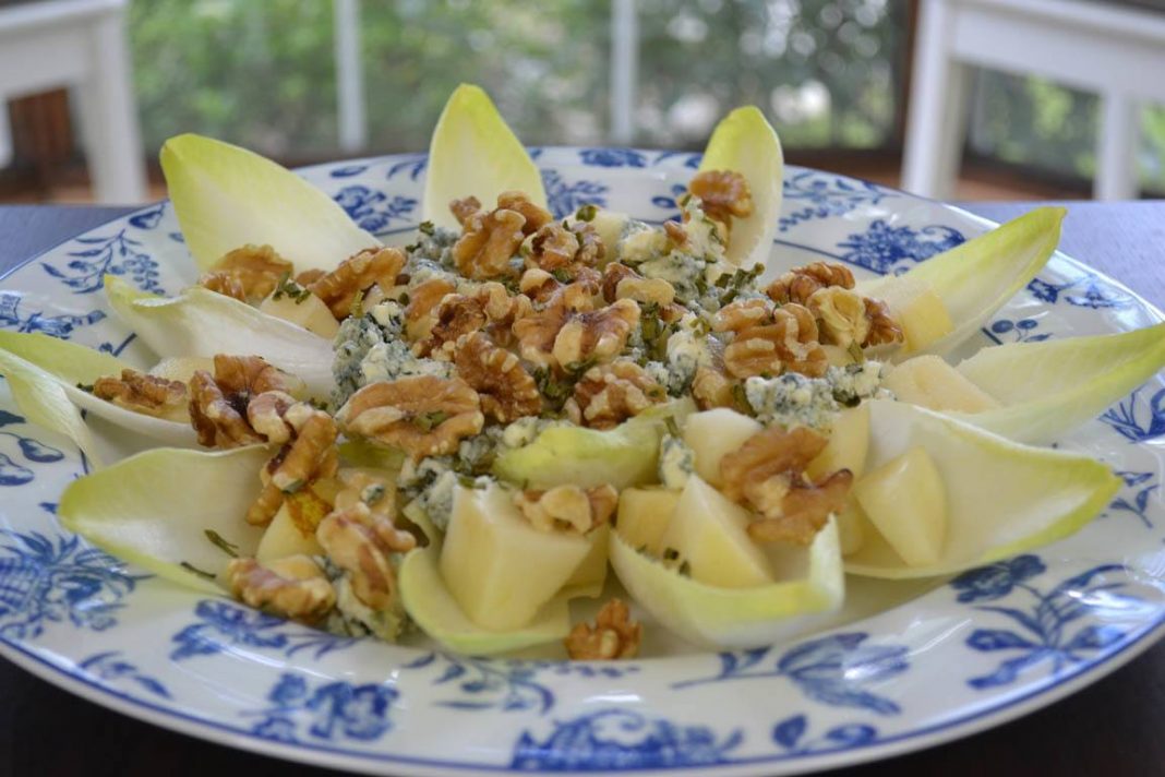 Otra opción igual de sencilla que el melón con jamón es esta ensalada de endibias. Si quieres hacerla más rica todavía la puedes aliñar con una salsa de mostaza muy sencilla. Pon en la batidora 5 cucharadas de aceite de oliva, 2 de miel, 1 de mostaza en grano y 2 de zumo de limón y tendrás una salsa exquisita. Para la ensalada, corta las hojas exteriores de la endibia y ponlas en el plato. Pela, corta y lamina la manzana y espárcela encima de la endibia y decora el plato con nueces. Lamina también el queso y espárcelo por el plato. Termina añadiéndole salsa al gusto.