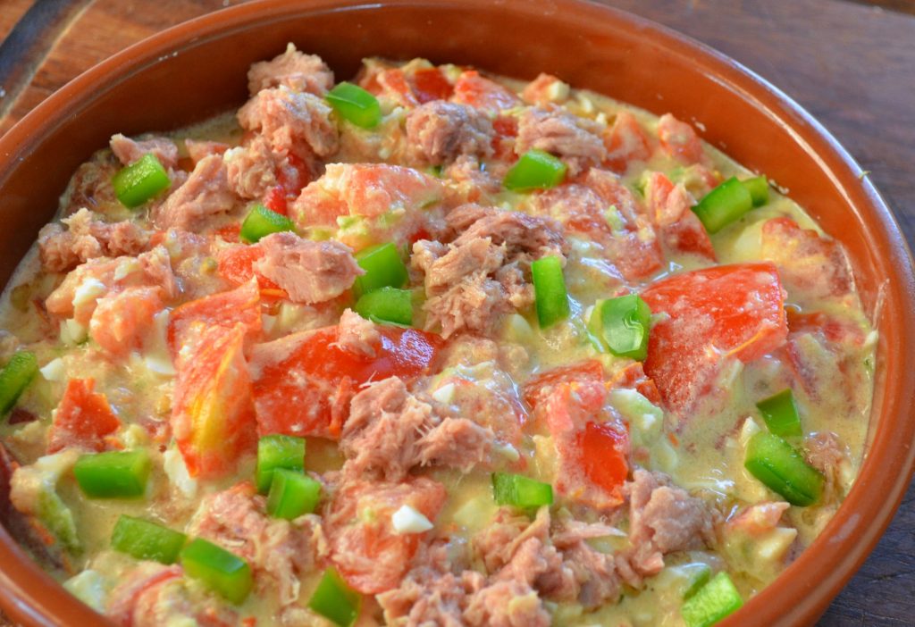 Para continuar con esta preparación, echas el aliño sobre los tomates y añades atún escurrido. Sigues mezclando y tapas con papel film. Dejas reposar en la nevera por una hora y ya puedes servirlo.