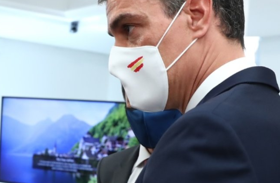 A pesar de que Moncloa ha intentado vender la vuelta de Sánchez de sus vacaciones en Doñana como algo planificado, la convocatoria hoy del Comité de Seguimiento del Coronavirus ha dejado en evidencia, como baticinaba Fernando Simón la semana pasada, que la pandemia no va bien. Ya estamos situados en los 2000 incrementos diarios. Más allá de lo preocupante de la situación, con el inicio del curso a la vuelta de la esquina, ha llamado mucho la atención la mascarilla que ha utilizado hoy Pedro Sánchez, del tipo higiénica, como la del propio Simón, pero con una bandera de España como único adorno sobre blanco impoluto. Quizás por eso ha llamado tanto la atención la propia bandera.