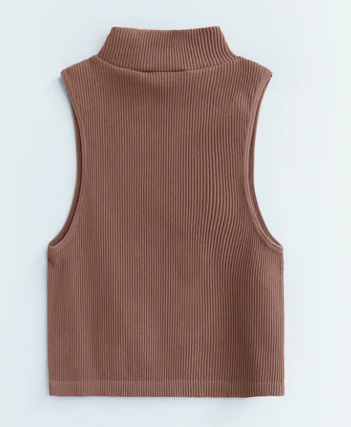 Aunque no es una camiseta propiamente dicha, no podemos dejar de traer aquí este top halter de Zara, fabricado con un tejido suave, con un 50% de poliamida reciclada, que se adapta como un guante al contorno del cuerpo. Tiene el cuello subido y manga sisa, es decir, tipo halter, un estilo de cuello que favorece a todas pero especialmente a las mujeres con hombros anchos y poco pecho. Combinado con las prendas y complementos adecuados, el resultado puede ser muy elegante. Está disponible en cuatro colores: khaki, negro, visón oscuro y rosa claro. El precio es de 7,95 euros.