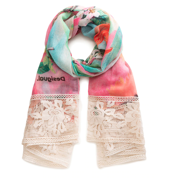 Otro complemento imprescindible son los fulares o pañoletas, porque nos ayudan a enriquecer cualquier look y crear combinaciones elegantes y que marcan la diferencia. Además se puede llevar tanto de día como de noche y en cualquier estación del año, para realzar nuestra imagen sobre todo cuando llevamos prendas básicas o minimalistas. Para esas ocasiones contar con un fular de la marca Desigual, es perfecto. Este que hemos visto en El Corte Inglés tiene un estampado de flores, muy colorido como todos los artículos de esta firma. Pero para hacerlo aún más especial, lleva un acabado de encaje rosa. Está fabricado de poliéster reciclado y tiene unas medidas de 100x195cm. La rebaja es del 50% y si antes costaba 49,95€, ahora lo tenemos a 24,95€.