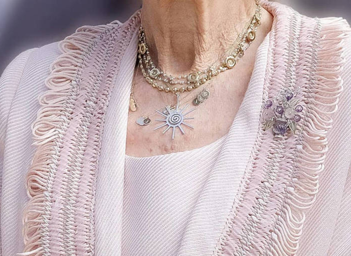 La monarca ha lucido en más de una ocasión un collar con el que homaneja a sus hijos y nietos. Se trata de una cadena dorada de la que cuelgan las letras E (Elena), C (Cristina), J (Juan), I (Irene), L (Leonor) y S (Sofía), las cuales se leen de forma clara. El resto de letras no se aprecian claramente.