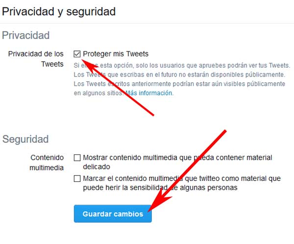 Lo que hacemos en Twitter es tuitear y escribir comentarios. Pues lo primero que tenemos que hacer es proteger lo que escribimos. Para hacer esto, hay que ir a la configuración de Seguridad y privacidad. En la sección Privacidad de los Tweets, marca la casilla junto a Proteger mis Tweets.