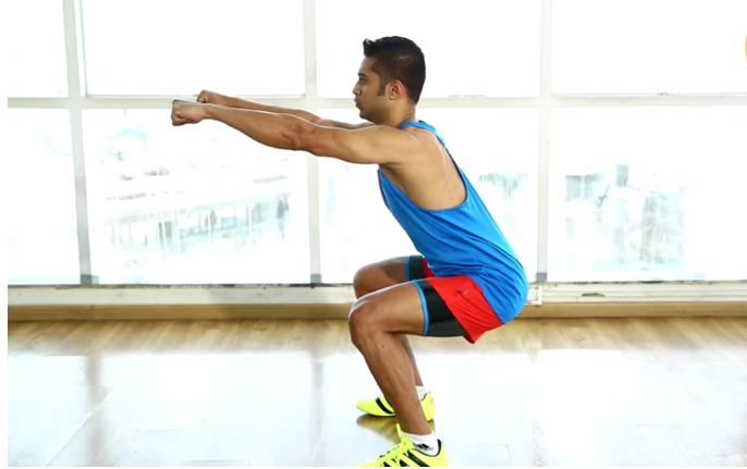 Se trata de otro de los ejercicios más completos que hay sin apenas movernos, y que utiliza tan solo tu peso corporal para lograr la pérdida de grasas y calorías. Con las sentadillas conseguimos fortalecer los músculos abdominales centrales y reforzamos el área de la cintura, pero además, ejercitaremos los músculos de las piernas tanto en su cara interna como externa, y el culo. Lo podemos hacer en cualquier sitio, y ni siquiera un mat necesitamos. De pie, nos colocamos como en la imagen, con los brazos en paralelo y hacie el frente y subimos y bajamos varias veces.