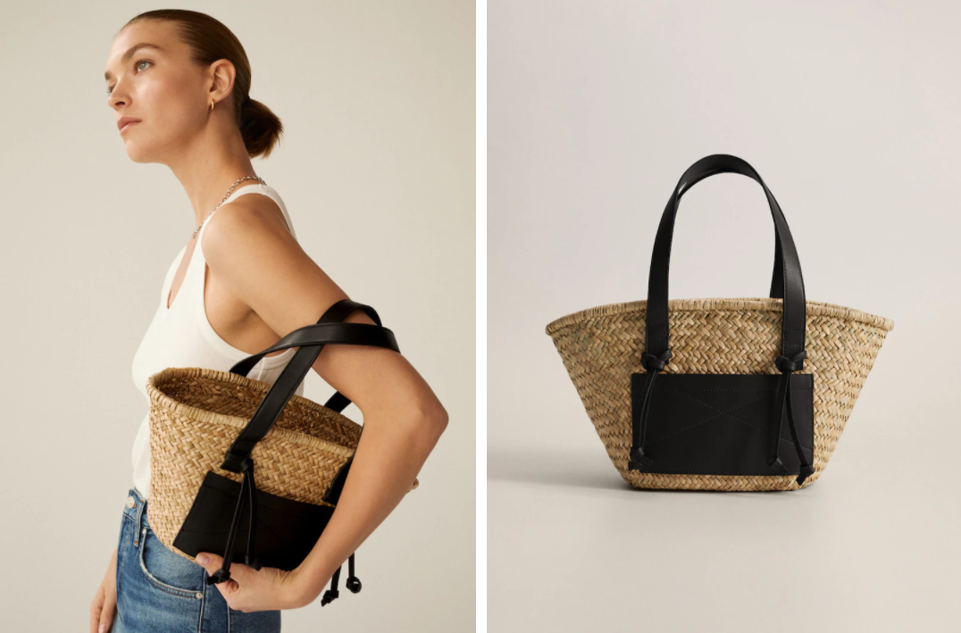 No podemos, por supuesto, irnos a la playa sin un lugar donde meter todas las cosas que tengamos. Una buena opción es elegir un capazo de paja. Este de Mango, es grande y con adornos interesantes en color negro que consiguen hacer un contraste bonito y elegante.