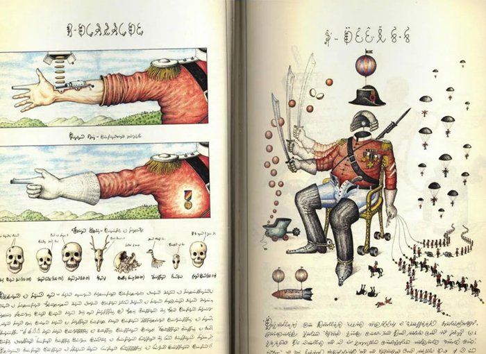 En él, el artista describe un mundo imaginario con imágenes surresalistas combinados con relatos. En sus páginas aparecen análisis de la flora y la fauna, mapas inverosímiles…, todo ello en un alfabeto desconocido y acompañado de una curiosa caligrafía.