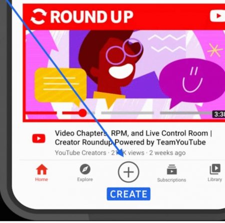 Pues de momento tienes que fijarte en un nuevo botón. Verás cómo aparece el símbolo «más» encerrado en un círculo (+) y está ubicado en el centro. Es fácil, se encuentra justo en la parte inferior de la pantalla. No vas a tener problemas porque es de gran tamaño, más alto y ancho de lo normal, como muestra esta imagen puedes ver que se diferencia bien del resto de los botones que tenemos en la app de Youtube.