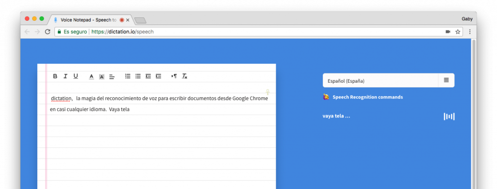 Estamos ante otras de las mejores aplicaciones para pasar el audio en texto online. Lo mejor es que es muy sencilla de utilizar y te muestra una leyenda con comandos de voz que puedes utilizar. Esto viene muy bien, cuando quieres escribir una coma o un punto o simplemente haga un salto de línea. Y es que este es el problema de siempre, que estos programas no reconocen las comas o los saltos de párrafo.