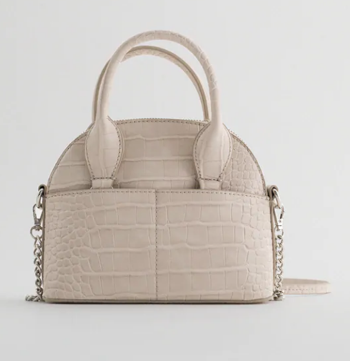 Este bolso estilo mini bowling de Zara nos ha gustado mucho por que es perfecto para ir elegante al trabajo cada día. Es de poliuretano al 100% con detalle de estampado animal. Lleva dos bolsillos en la parte delantera y otros dos en la trasera, lo hace que sea un complemento muy práctico además de bonito. Tiene un asa de hombro de cadena combinado con el material estampado del cuerpo del bolso. También lleva dos asas más cortas para convertirlo en un bolso de mano. Lo encontraremos en dos colores distintos: blanco crema y gris visón. El precio es de tan solo 17,95 €.