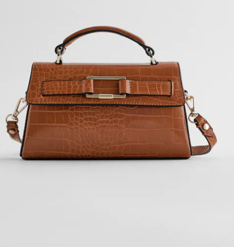Otro bolso de Zara de esta temporada perfecto para llevar a la oficina es este en formato bandolera dos en uno. El asa de hombro es ajustable pero se puede extraer si queremos utilizarlo como bolso de mano, ya que lleva también una asa en la parte superior. Lleva un práctico bolsillo interior que cierra con cremallera para guardar el móvil o las llaves. El cierre exterior es mediante imanes. Está fabricado en poliéster con estampado animal y las medidas son 12 x 21,5 x 5 cm (alto x ancho x fondo). Lo encontraremos en dos colores, un original naranja teja y en negro más discreto. Tiene un precio de 19,95 €.