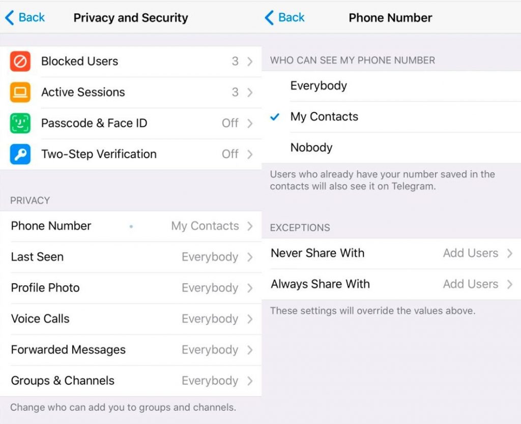 Sin embargo, Telegram es un programa que cuida mucho la privacidad. Los desarrolladores realizaron actualizaciones en la tecnología para «proveer mayor privacidad y seguridad», lema del servicio. Telegram usa la política de privacidad de 2018, que cumple el GDPR de la Unión Europea. Los datos almacenados son direcciones IP, número telefónico, los contactos y ajustes del perfil guardados en los centros de datos.