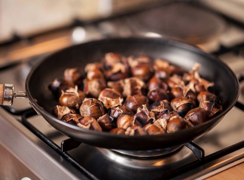 Lo mejor es hacerlas al fuego, si tenemos cocina de gas, porque quedan mejor. En cuanto a la sartén, podemos comprar una especial que tiene agujeros en la superficie. Así las castañas se asan casi directamente al fuego. Al ser un recipiente más pequeño es posible que tengamos que hacer varias tandas. Es tan fácil como colocar las castañas sin tapar con el fuego fuerte y vigilar hasta que estén hechas. Hay que moverlas de vez en cuando para que se asen por todas partes y evitar que se quemen. Se suelen hacer en una media hora pero podemos ir probando una de vez en cuando para cogerles el punto. En vitrocerámica se preparan igual pero usando una sartén normal. Tardarán un poco más en hacerse y en este caso sí se recomienda usar tapa para mantener la humedad.