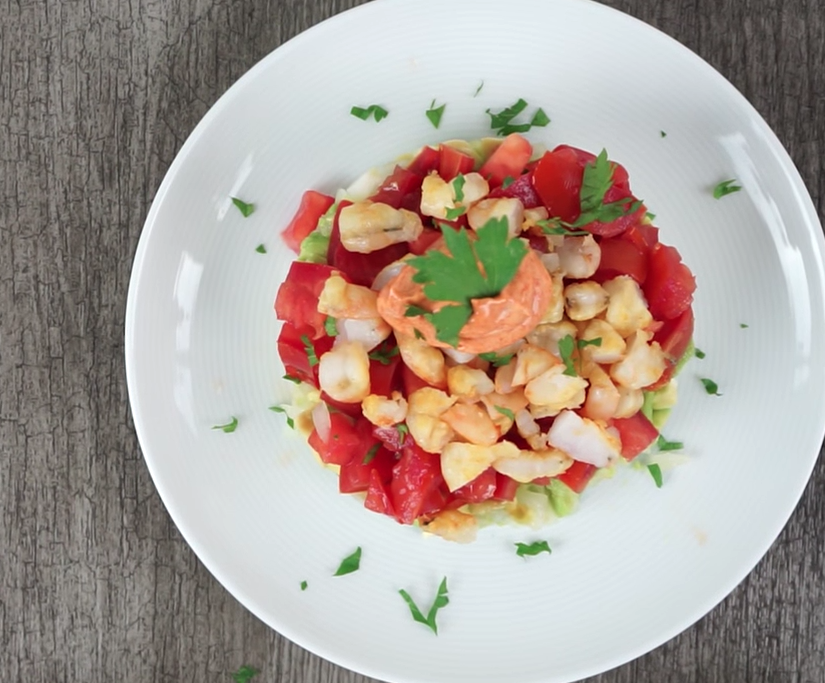 Finalmente lo emplatamos ayudándonos de un aro de repostería. Colocamos una capa de la mezcla de tomate, otra de aguacate y finalizamos con los langostinos. Hay que presionar un poco para que tome la forma del molde. Retiramos el aro y servimos rociando con unas gotas de aceite y decorando con un poco de perejil, o una pizca de cebollino.