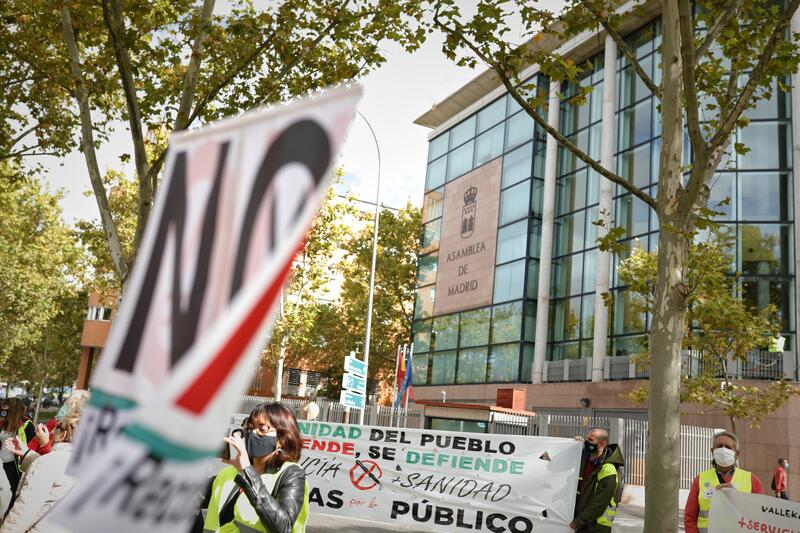 Colectivos ciudadanos se han concentrado esta mañana frente a la Asamblea de Madrid en defensa de la Sanidad Pública y para exigir la dimisión de la presidenta de la Comunidad de Madrid, Isabel Díaz Ayuso.