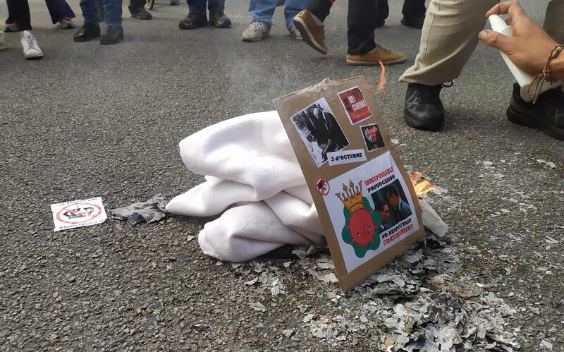 Los participantes llevaban banderas independentistas y carteles con el lema ‘A Cataluña no tenim rei’ (En Cataluña no tenemos rey), así como pancartas en solidaridad con los presos del 1-O.