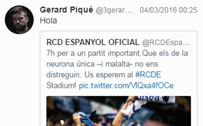Desde la cuenta oficial del Espanyol emitieron un mensaje que para animar a su afición ponía en cuestión de manera indirecta al barcelonismo al hablar de «los de la neurona única y enferma. La pareja de Shakira contestó con un “Hola”, muy corto, pero muy irónico. Y es que es una de las técnicas que mejor maneja el catalán.
