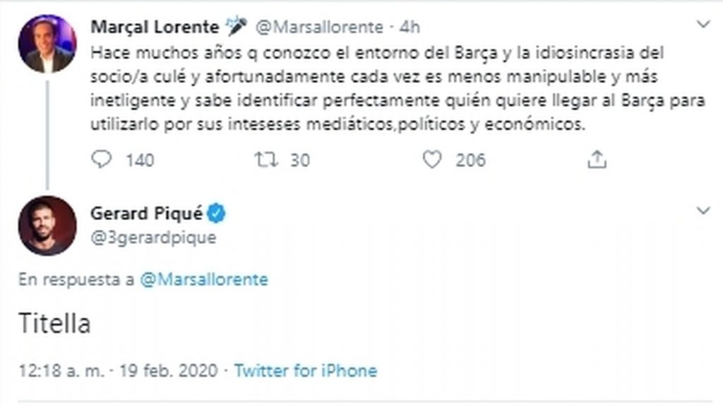En otra ocasión, Piqué llamó «títere» a través de Twitter a un periodista afín a la directiva de Bartomeu, presidente del FC Barcelona. «No era un mensaje hacia la directiva. Todas las directivas y gente de poder tienen personas afines y que le dan sensación de proteger. Si el equipo funciona da igual lo que pase dentro del club o los números económicos», opinó.
